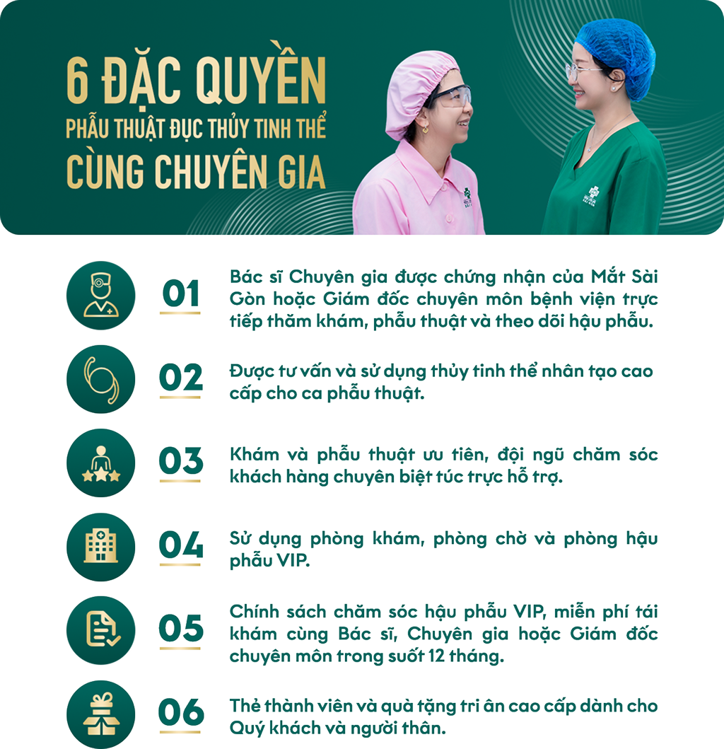 Dịch vụ phẫu thuật đục thủy tinh thể cùng chuyên gia tại Mắt Sài Gòn được thiết kế để cùng Quý khách hàng dành những điều tốt nhất cho đôi mắt. Với những đặc quyền ưu tiên về Bác sĩ Chuyên gia, Quy trình điều trị và Chính sách chăm sóc hậu phẫu, hành trình tìm lại thị lực sắc nét cho đôi mắt thật an tâm và trọn vẹn.