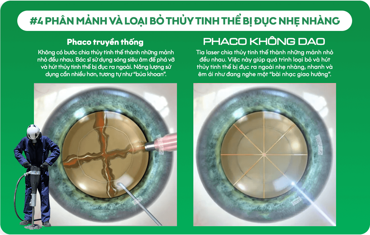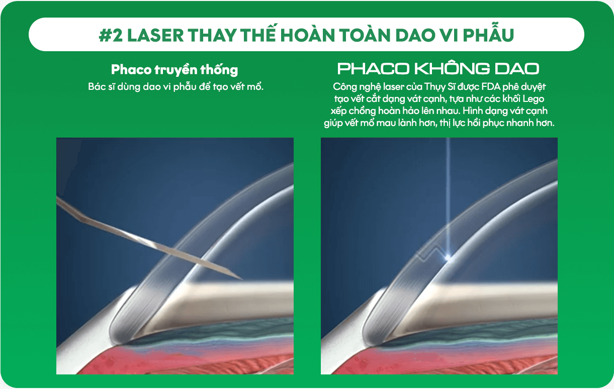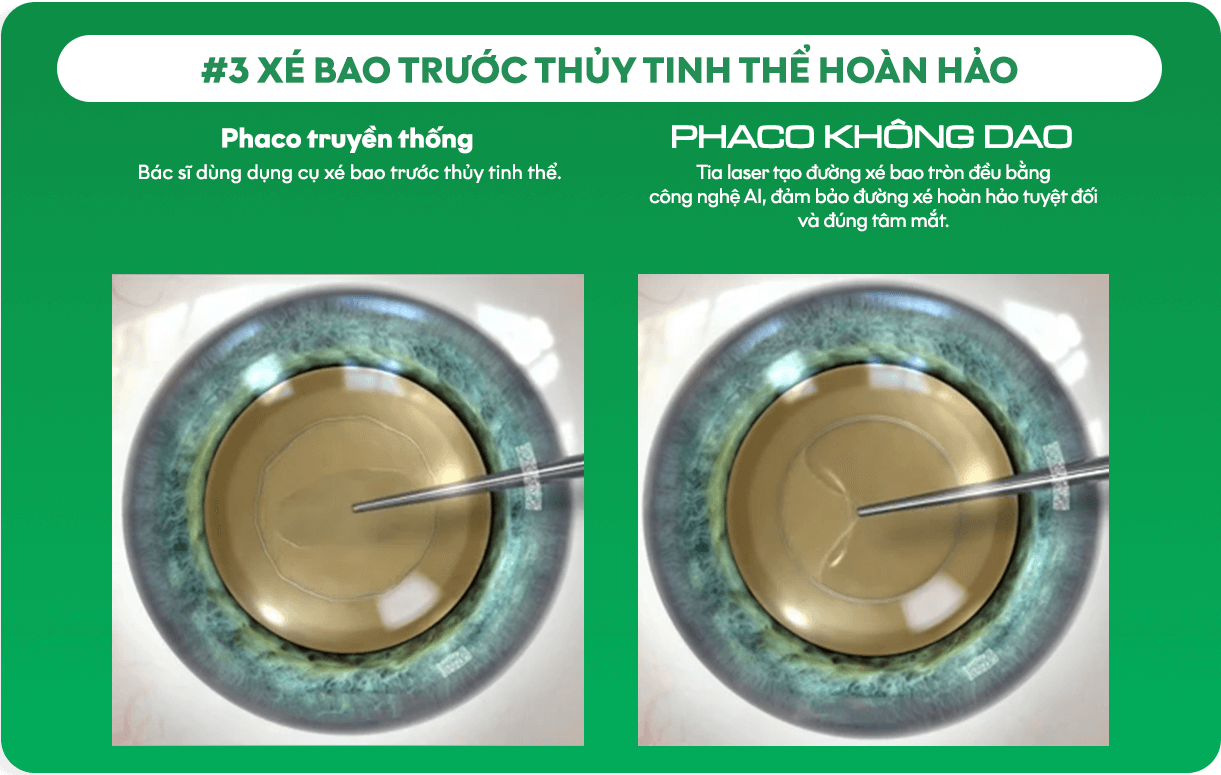 Công nghệ PHACO KHÔNG DAO* đã đưa phẫu thuật đục thủy tinh thể đã bước sang một kỷ nguyên mới. Với sự ứng dụng hoàn hảo của tia laser trong điều trị, công nghệ PHACO KHÔNG DAO mang đến độ chính xác và an toàn vượt trội so với phương pháp PHACO truyền thống. Điều trị đục thủy tinh thể bằng PHACO KHÔNG DAO, bệnh nhân an tâm hơn vì bác sĩ hoàn toàn không sử dụng dao vi phẫu trong quá trình phẫu thuật. Quy trình phẫu thuật “không chạm” mang đến trải nghiệm nhanh chóng, nhẹ nhàng và an tâm hơn cho bệnh nhân.